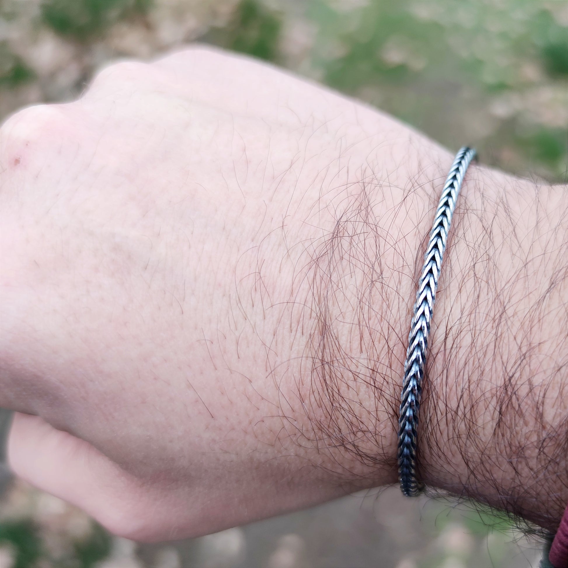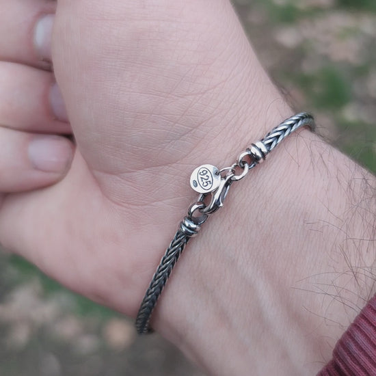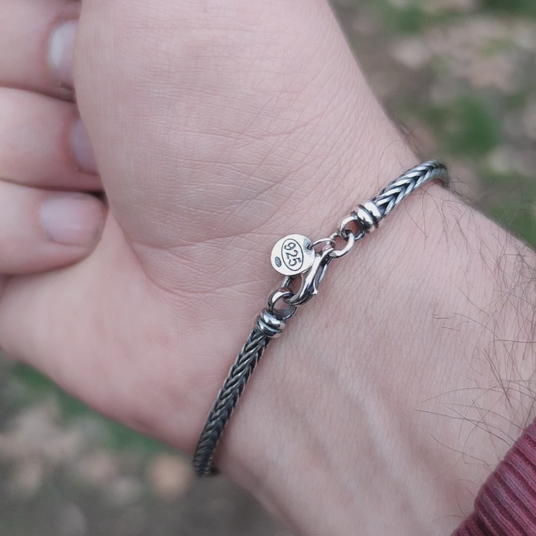 Questo bracciale da uomo, denominato “catena coda di volpe”, è realizzato in **argento 925 anticato** con finitura brunito nero che sviluppa suggestivi effetti di chiaroscuro. Con uno spessore di circa **3 mm**, la maglia “coda di volpe” combina leggerezza e resistenza, risultando ideale sia per uso quotidiano che per occasioni speciali.